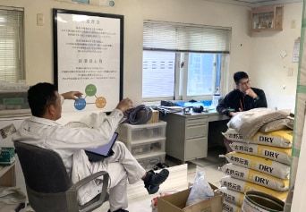 - 研修センターで技能五輪について真剣な面持ちで話す泰喜さんと社長。