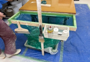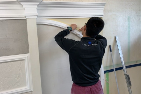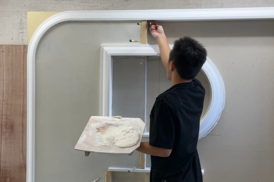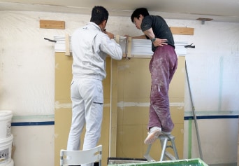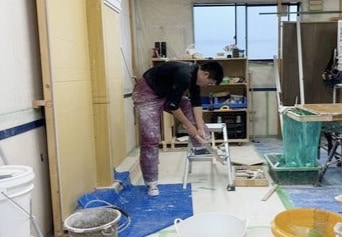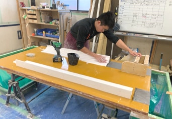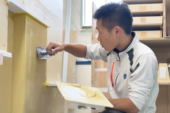高校2年生で左官の仕事と出会い、泰喜さんは「技能五輪で金メダルを取る」と宣言して中屋敷左官工業へ入社。入社後は休日返上で塗り壁トレーニングに励み、社長からもそのストイックさを高く評価されていました。練習初期には道具配置や動作の無駄を改善するため、道具棚の整理などにも着手。「美しく、無駄なく」という社長の教えを体現する日々が始まります。