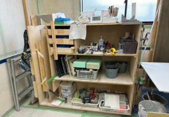 - 道具と材料が混在する空間に、改善の余地あり。ここから“整理整頓”が始まった。