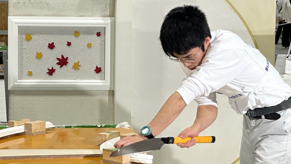 - 自由課題は紅葉と枯山水がモチーフ。職人仲間からの協力やアイデアで作品に彩りを添えた。